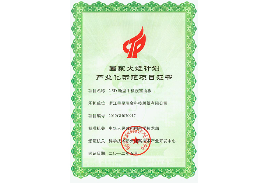 11.2.1-21國(guó)家火炬計(jì)劃產(chǎn)業(yè)化示范項(xiàng)目證書(shū)201205