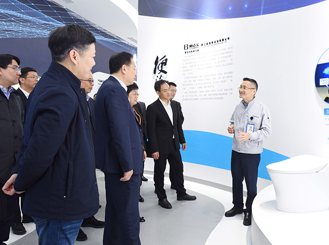 蔣亦標總裁向領導一行詳細介紹了星星從三十多年前的家庭手工作坊成長為如今多元發展的現代化企業集團的奮斗歷程,指出當前的星星通過穩健經營,旗下子公司產品銷售已遍布全球,持續多年躋身于中國制造業500強、全國民營企業500強、浙江省百強制造業、國家高新技術企業企業行列,且在智能制造、綠色制造的道路上已經走在行業前沿。下階段,星星將繼續深耕制造主業,做大光電子產業,做強智能馬桶產業,做精冷鏈產業,增強主要子公司在其行業的話語權;同時,強化生態園區建設,通過做優中小微企業的孵化與服務,進一步整合產業鏈,做好生態鏈工程,實現“再造一個星星”的目標。隨后,星星冷鏈楊文勇總經理與星星便潔寶總經理黃朝陽分別就各自在制造升級中的亮點與瓶頸向領導一行作了簡要匯報。